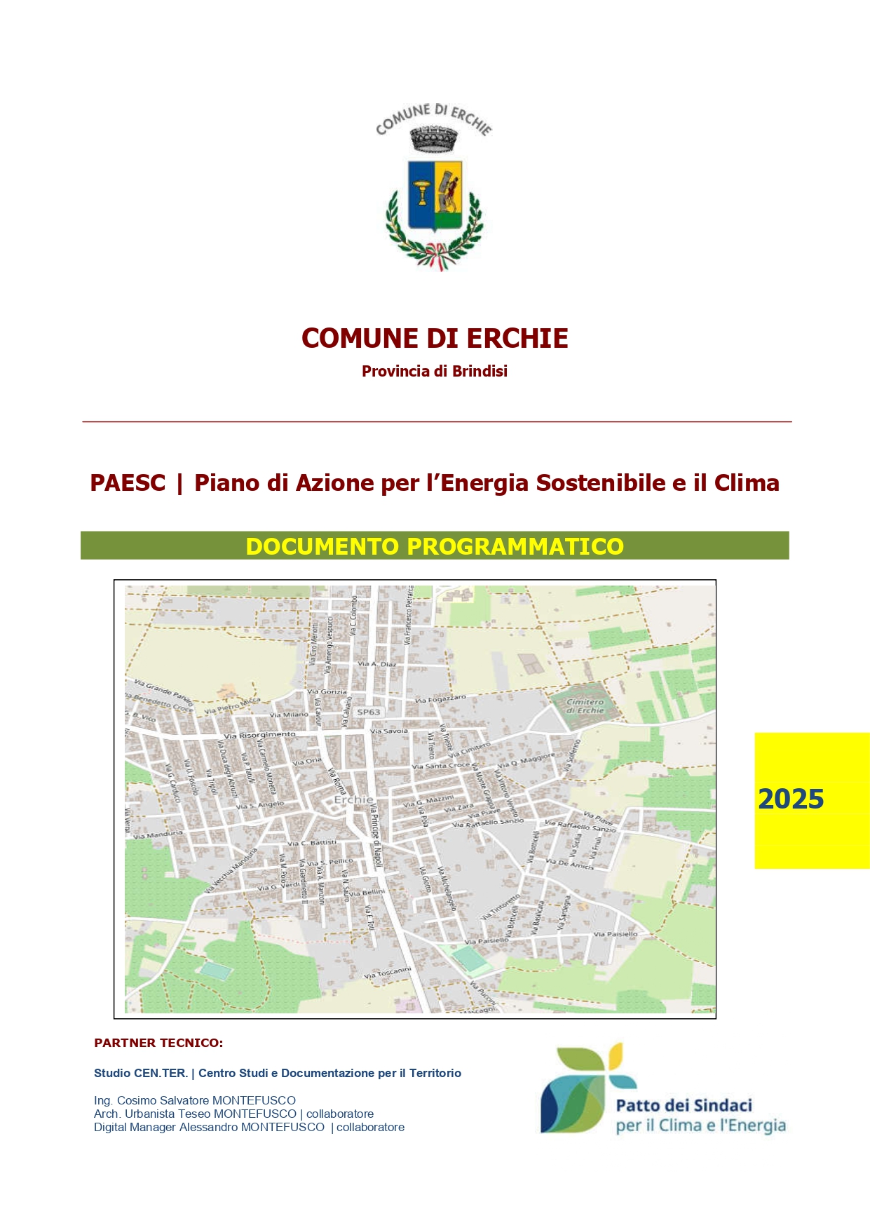 Il Comune di Erchie ha aderito al Patto dei Sindaci per il Clima e l’Energia con Delibera di Consiglio Comunale n. 38 del 23/09/2022 sostenendo gli obiettivi della politica energetica comunitaria in termini di riduzione delle emissioni di CO2. L’Amministrazione Comunale si impegna a presentare entro due anni dall’adozione del PAESC (Piano di Azione per l’Energia Sostenibile e il Clima) un documento che indichi le azioni da intraprendere per raggiungere l’obiettivo di riduzione del 55% dei gas ad effetto serra entro il 2030.